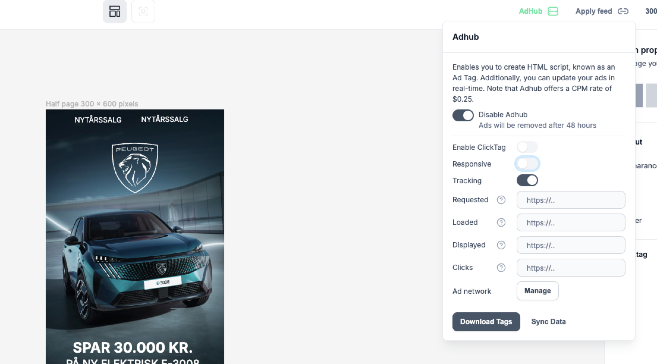 With AdHub, you no longer have to worry about ad size limitations, frequent re-uploads, or manual updates. Our hosting service streamlines ad management while providing cost-effective pricing at just $0.25 CPM.
