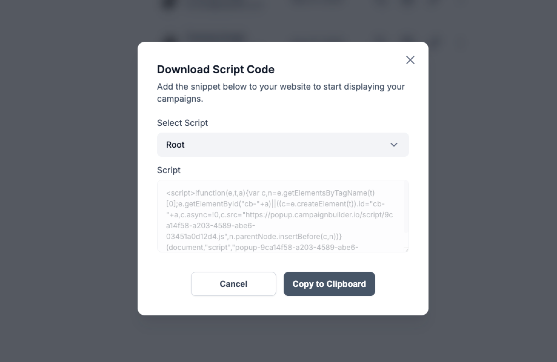 To begin, log in to your account and make sure your website has the embed code installed. This ensures that popups will appear seamlessly wherever you want them to. If you place your popups in folders, you are able to download a script for each folder.