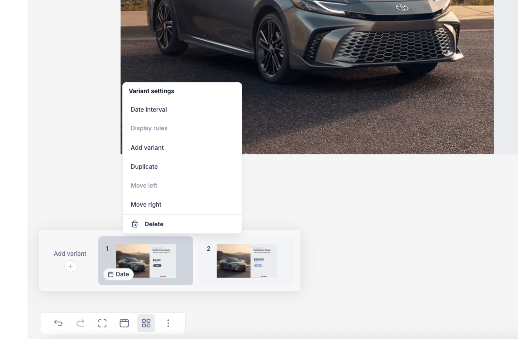 Important: The last Variant in your campaign acts as a fallback. It is always shown when no other Variant's rules or date conditions are met. Because of this, the last Variant cannot have rules assigned to it. This ensures there’s always a default ad version ready to display, keeping your campaign running smoothly at all times.